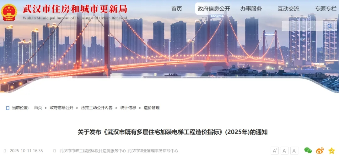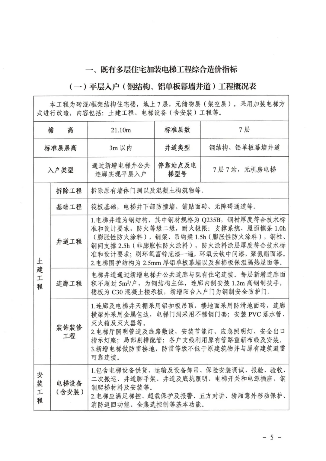 武汉市发布《武汉市既有多层住宅加装电梯工程造价指标》